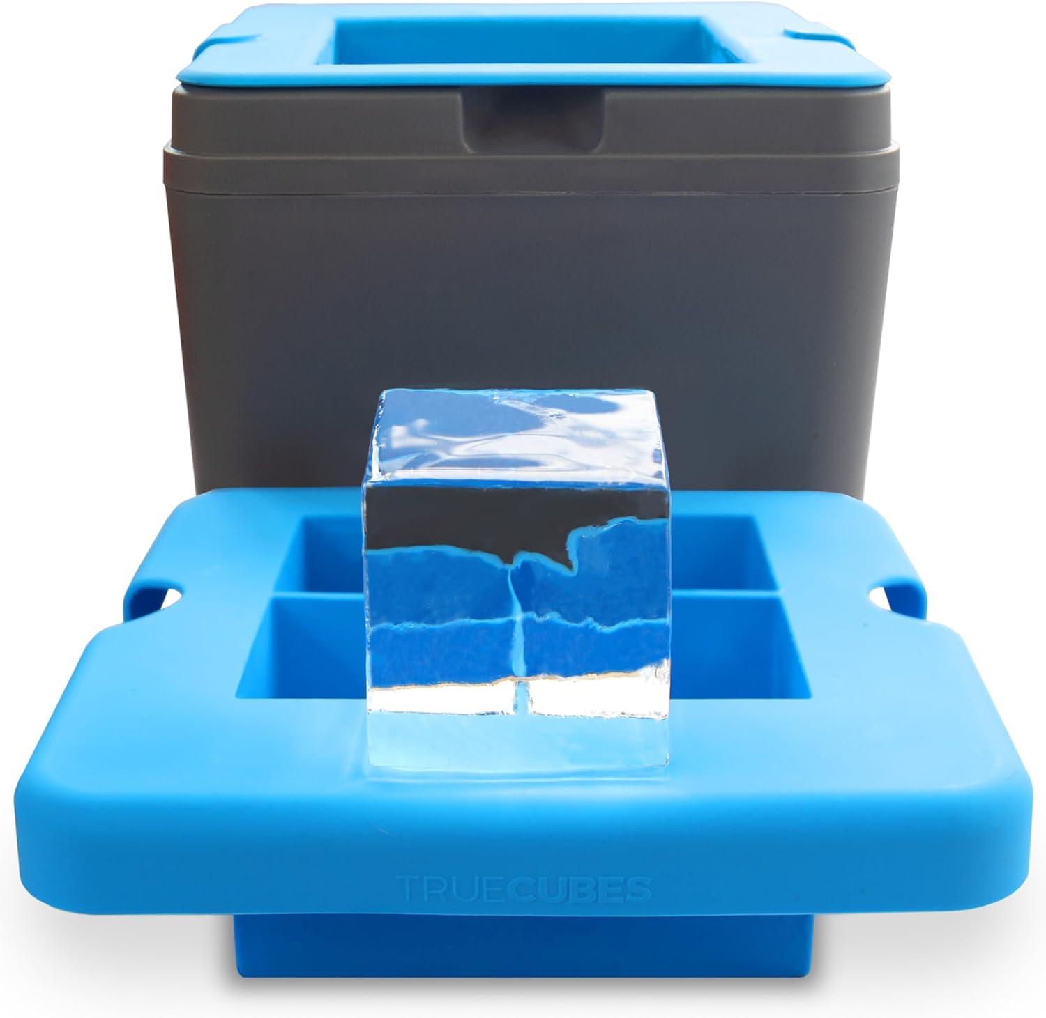 Unclear ice has air trapped in it. Ice freezes directionally. These clear ice makers are designed so that the ice freezes from the top down, pushing the air to the bottom of the container. Each cube shaped part has a hole at the bottom for the air to escape. The sides and bottom are insulated so that those areas freeze last.