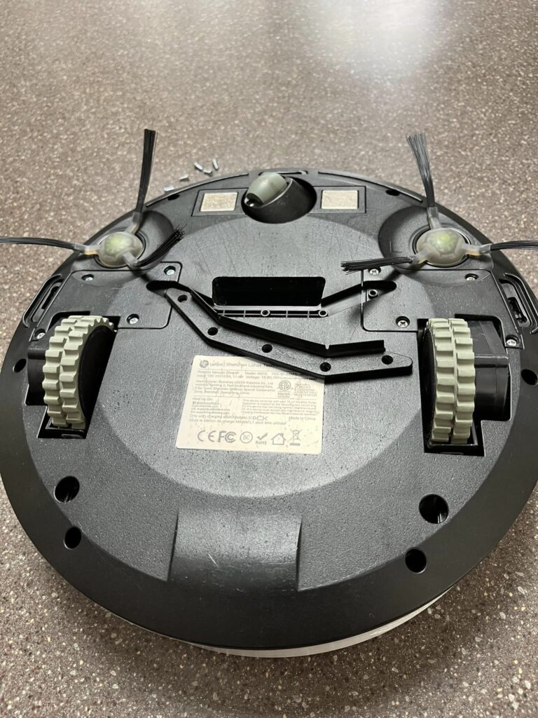 It has a bunch of sensors to avoid walls and stairs. And it comes with an app that isn’t very easy to connect and a remote. Neither one is really necessary. I just hit the “on” button and off it goes. It is even smart enough to find its charging station when its battery runs low, which is only after about two hours of driving around the house. It’s relatively quiet and fits under the furniture.