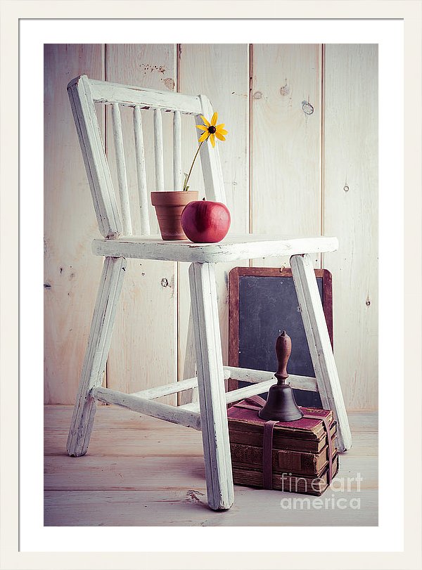 Note: The watermark in the lower right does not appear in the final print. School books and an old school bell in a school-themed still…